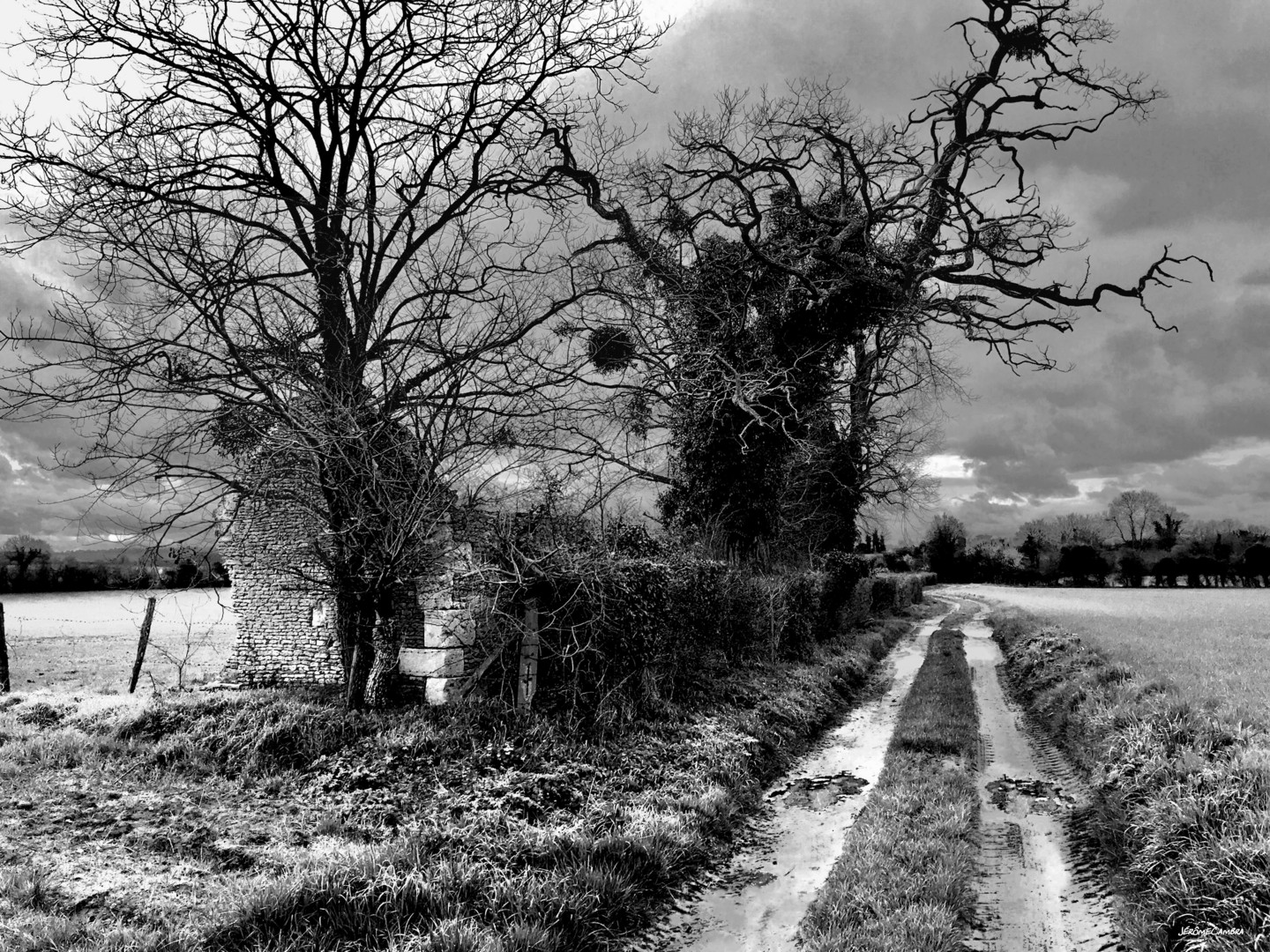 un chemin bordé des vestiges d'une ancienne bergerie et d'arbres de haut jet s'éloigne à perte de vue